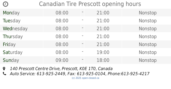 It is also possible to : Edit these OPENING HOURS of Store Canadian Tire In Prescott, 140 Prescott Centre Drive,