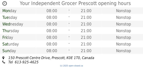 It is also possible to : Edit these OPENING HOURS of Store Your Independent Grocer In Prescott, 150 Prescott Centre Drive,
